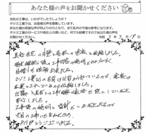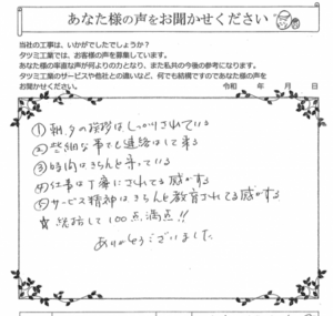 ちょうど工事を依頼する業者を探していたところ新聞の広告にタツミさんのチラシが入っていたので、見積りをお願いしました。1社で決めるつもりはありませんでしたが、現在の壁、屋根の状態を詳しく調べて見積もりを出して頂きました。費用が高額の為、他社でも見積り予定でしたが、社長の誠意ある対応でタツミさんに決めました。作業に関しては細かなところまで丁寧に作業をして頂き満足しております。又、実際に作業いただきました職人の方は近所の方にも好印象の対応でした。すべての作業終了時に、作業内容をまとめたブックレットをもらい、家族全員感動いたしました。タツミさんに依頼して本当によかったと思っています。ありがとうございました。