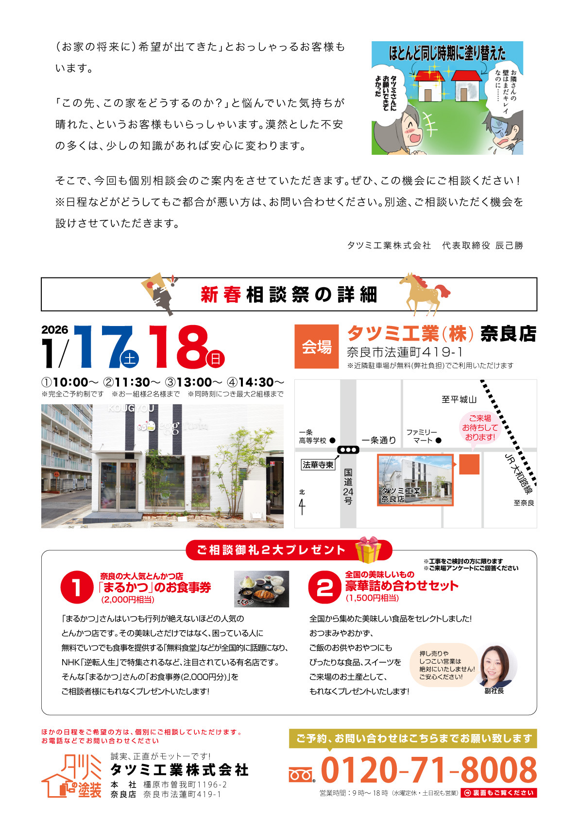 お電話(0120-718-008)またはメール(info@t-kougyou.com) にてご予約下さいませ。