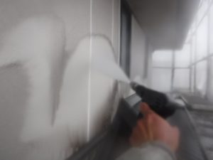 外壁材を保護し、上に塗る塗料の密着を良くするため、下塗り剤を塗ります。