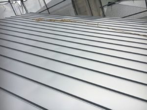 (左)粘着ルーフィングを敷き、雨水の浸入を防ぎます。(右)ガリバリウム立平をビスで施工します。