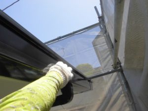外壁材を保護し、上に塗る塗料の密着を良くするため、下塗り剤を塗ります。