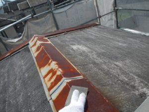 屋根材を保護し、上に塗る塗料の密着を良くするため、下塗り剤を塗ります。