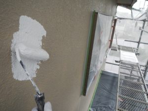 外壁材を保護し、上に塗る塗料の密着を良くするため、下塗り剤を塗ります。