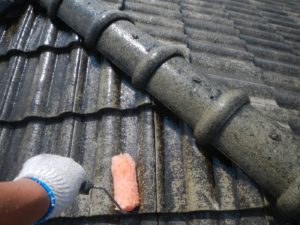 屋根材を保護し、上に塗る塗料の密着を良くするため、下塗り剤を塗ります。