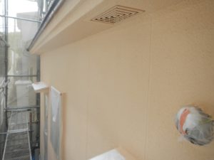 外壁材を保護し、上に塗る塗料の密着を良くするため、下塗り剤を塗ります。