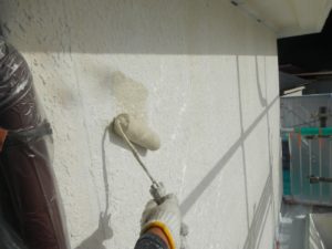 外壁材を保護し、上に塗る塗料の密着を良くするため、下塗り剤を塗ります。