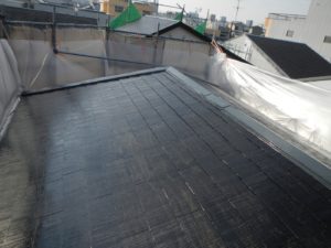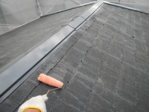 屋根材を保護し、上に塗る塗料の密着を良くするため、下塗り剤を塗ります。