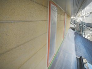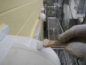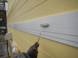 外壁材を保護し、上に塗る塗料の密着を良くするため、下塗り剤を塗ります。