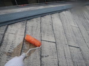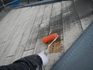 屋根材を保護し、上に塗る塗料の密着を良くするため、下塗り剤を塗ります。