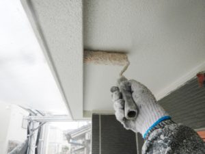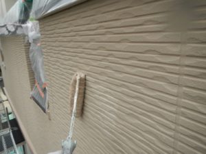 外壁材を保護し、上に塗る塗料の密着を良くするため、下塗り剤を塗ります。