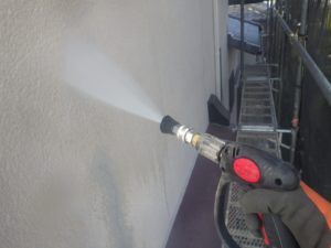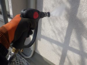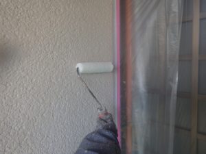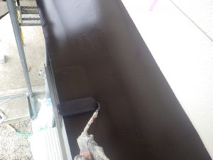 外壁材を保護し、上に塗る塗料の密着を良くするため、下塗り剤を塗ります。