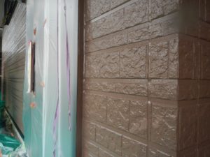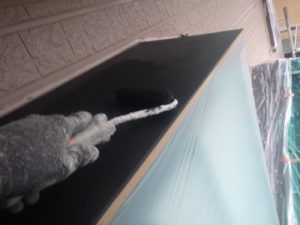 外壁材を保護し、上に塗る塗料の密着を良くするため、下塗り剤を塗ります。