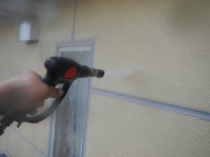 外壁材を保護し、上に塗る塗料の密着を良くするため、下塗り剤を塗ります。