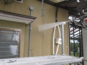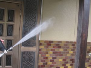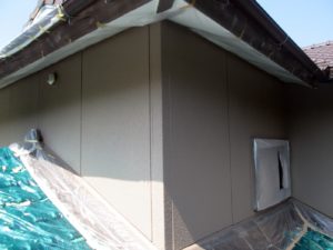 外壁材を保護し、上に塗る塗料の密着を良くするため、下塗り剤を塗ります。