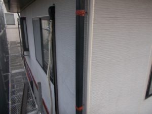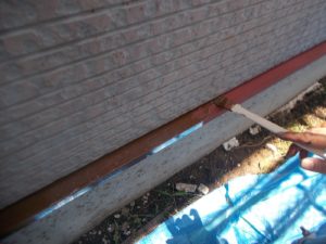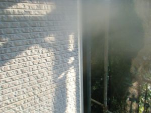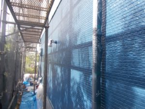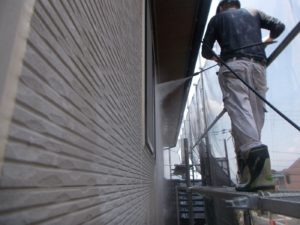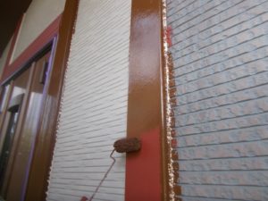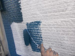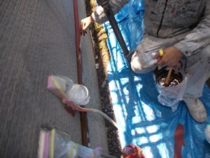 外壁材を保護し、上に塗る塗料の密着を良くするため、下塗り剤を塗ります。