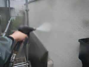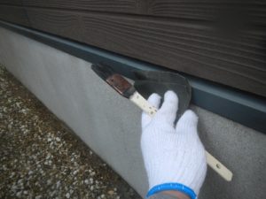 外壁材を保護し、上に塗る塗料の密着を良くするため、下塗り剤を塗ります。
