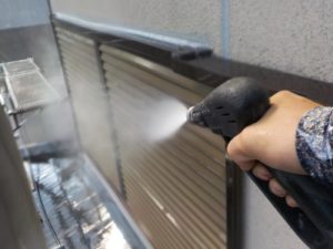 外壁材を保護し、上に塗る塗料の密着を良くするため、下塗り剤を塗ります。