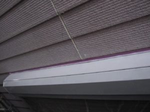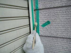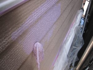 外壁材を保護し、上に塗る塗料の密着を良くするため、下塗り剤を塗ります。