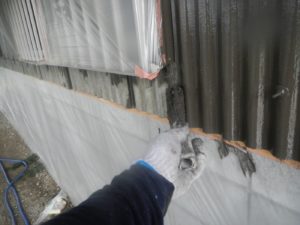 外壁材を保護し、上に塗る塗料の密着を良くするため、下塗り剤を塗ります。