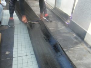 屋根材を保護し、上に塗る塗料の密着を良くするため、下塗り剤を塗ります。