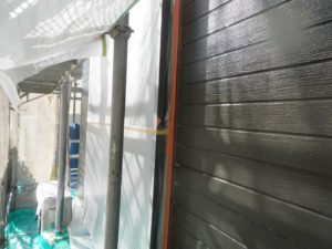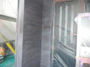 外壁材を保護し、上に塗る塗料の密着を良くするため、下塗り剤を塗ります。