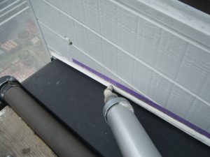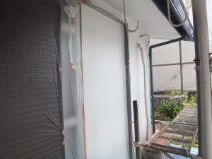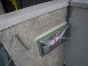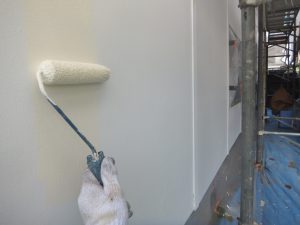 外壁材を保護し、上に塗る塗料の密着を良くするため、下塗り剤を塗ります。