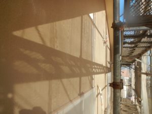 外壁材を保護し、上に塗る塗料の密着を良くするため、下塗り剤を塗ります。