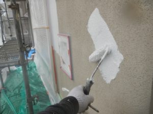 下地の強化・中性化・上塗材の密着不良・造膜不良等を防止するため、下地調整塗材を塗ります。