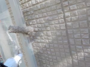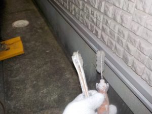 外壁材を保護し、上に塗る塗料の密着を良くするため、下塗り剤を塗ります。
