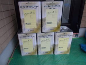 塗膜のひび割れや、壁のひび割れなどを目埋めするために中塗り剤を塗ります。