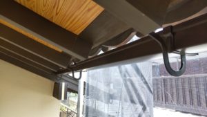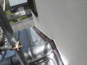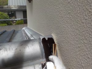 (左)軒樋を乗せます。(右)縦樋を取り付けます。