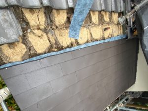 (左)屋根材・水切りを設置します。(右)ビスで下地材にしっかり固定を行います。