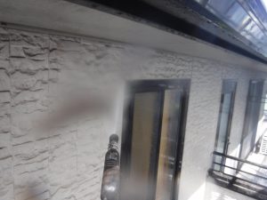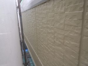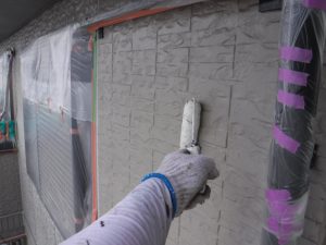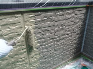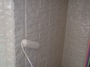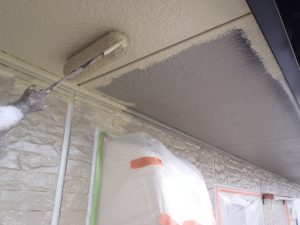 外壁材を保護し、上に塗る塗料の密着を良くするため、下塗り剤を塗ります。