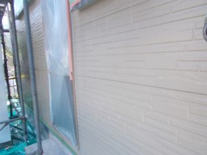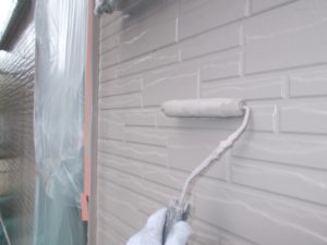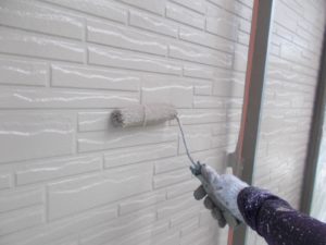 外壁材を保護し、上に塗る塗料の密着を良くするため、下塗り剤を塗ります。