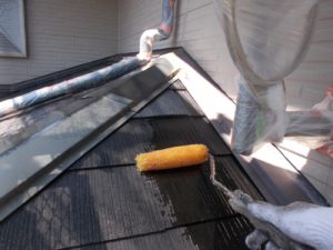 屋根材を保護し、上に塗る塗料の密着を良くするため、下塗り剤を塗ります。