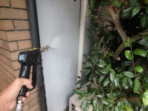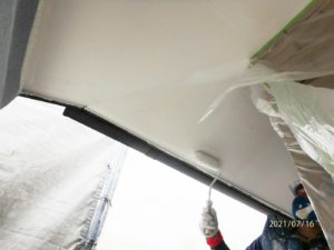 外壁材を保護し、上に塗る塗料の密着を良くするため、下塗り剤を塗ります。