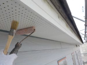 外壁材を保護し、上に塗る塗料の密着を良くするため、下塗り剤を塗ります。