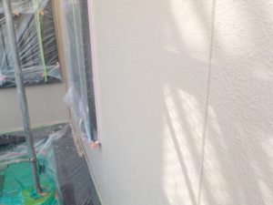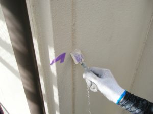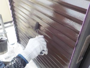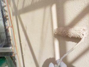 外壁材を保護し、上に塗る塗料の密着を良くするため、下塗り剤を塗ります。