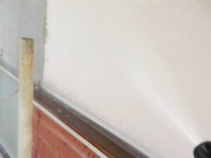 外壁材を保護し、上に塗る塗料の密着を良くするため、下塗り剤を塗ります。