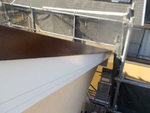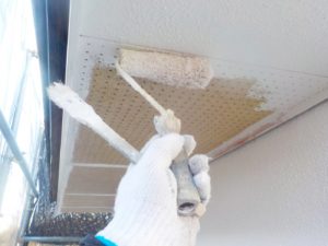 外壁材を保護し、上に塗る塗料の密着を良くするため、下塗り剤を塗ります。