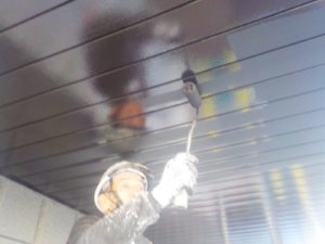 屋根材を保護し、上に塗る塗料の密着を良くするため、下塗り剤を塗ります。