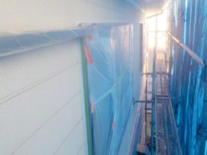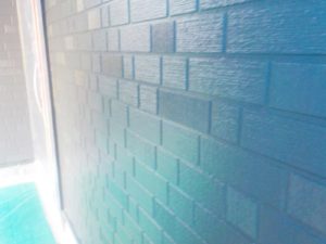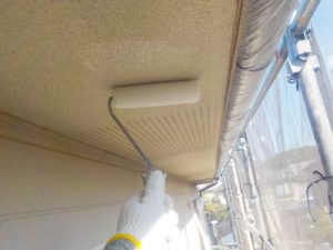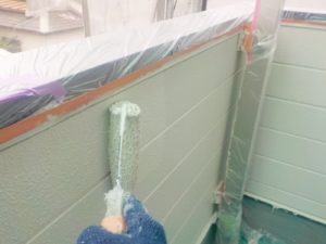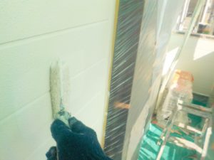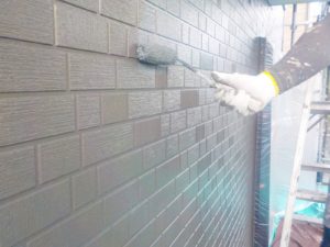 外壁材を保護し、上に塗る塗料の密着を良くするため、下塗り剤を塗ります。