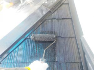 屋根材を保護し、上に塗る塗料の密着を良くするため、下塗り剤を塗ります。