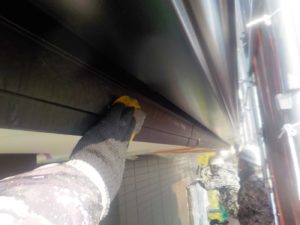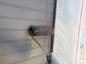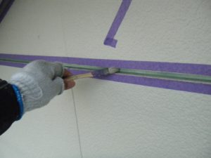 外壁材を保護し、上に塗る塗料の密着を良くするため、下塗り剤を塗ります。