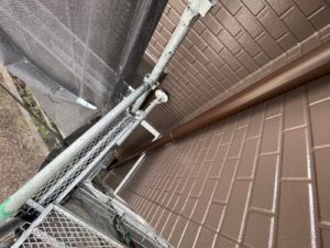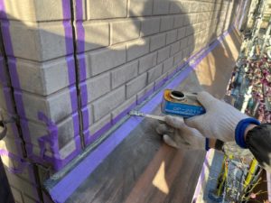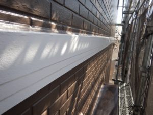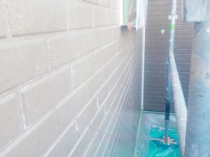 外壁材を保護し、上に塗る塗料の密着を良くするため、下塗り剤を塗ります。