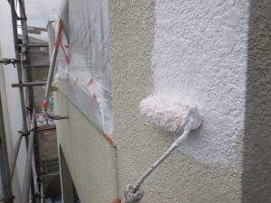 外壁材を保護し、上に塗る塗料の密着を良くするため、下塗り剤を塗ります。