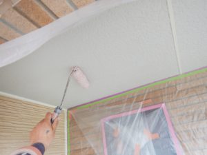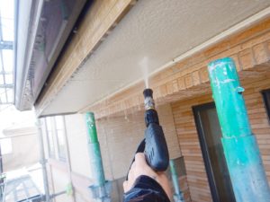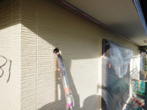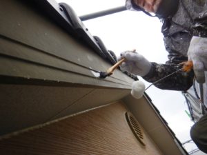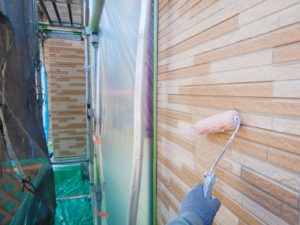 外壁材を保護し、上に塗る塗料の密着を良くするため、下塗り剤を塗ります。