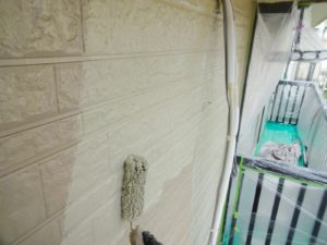 外壁材を保護し、上に塗る塗料の密着を良くするため、下塗り剤を塗ります。