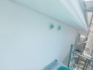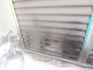 外壁材を保護し、上に塗る塗料の密着を良くするため、下塗り剤を塗ります。