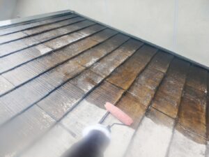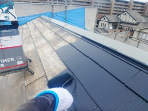 屋根材を保護し、上に塗る塗料の密着を良くするため、下塗り剤を塗ります。